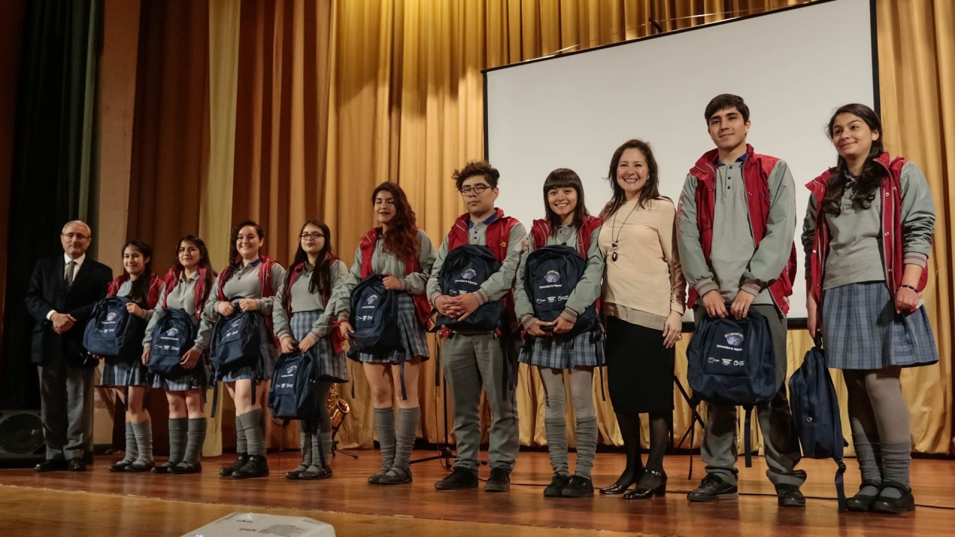 Luego se entregó a cada estudiante una mochila con materiales de trabajo, simbolizando las herramientas desarrolladas en el transcurso del programa y que los acompañarán en su proceso de formación y futura inserción a la UV. Y a continuación, hizo uso de la palabra, en representación de los estudiantes egresados del programa, Noelia Silva, estudiante de la primera generación, que en la actualidad se encuentra ad portas de su egreso y titulación de Ingeniería Comercial.